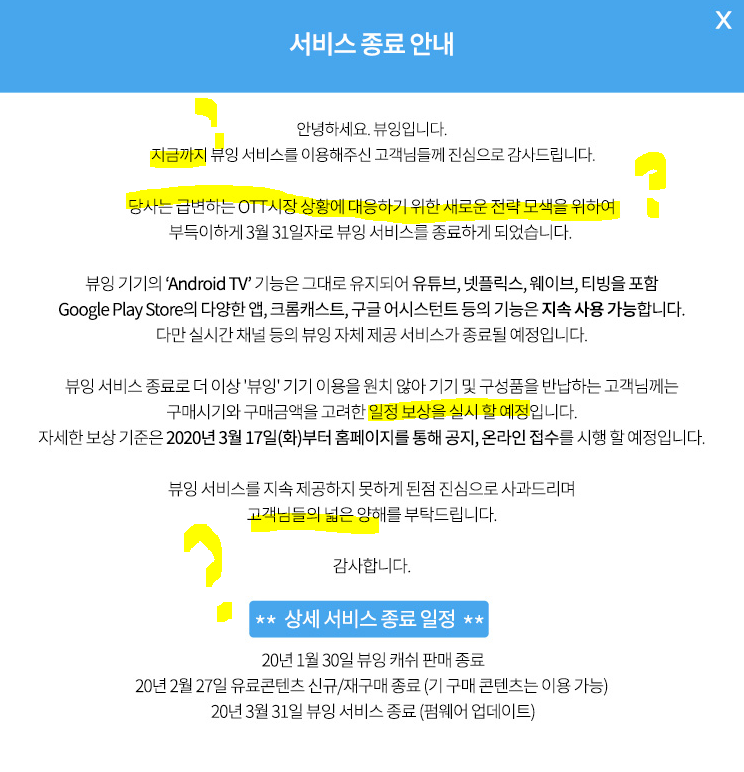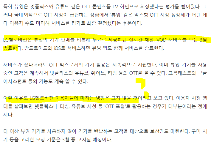 당사는 급변하는 OTT 시장 상황에 대응하기 위한 새로운 전략 모색을 위하여?? 자기들 중심의 안내문, 뷰잉 구매한 고객들은 안중에도 없습니다 자기들 전략을 모색을 위해서랍니다 개인적으로 드는 생각은 '당사는 스틱 서비스에 이어 뷰잉 서비스도 완전 실패하여' 로 써야 된다고 생각합니다. 어딜 급변하는 OTT 시장 핑계를 대나요? 새로운 전략 모색을 위하여?? 뭐 또 만들어서 팔고 싶은 건가요? 스틱 팔다 망하고 뷰잉 팔다 망하고 다음에는 뭘 또 하겠다고 합니다. 지금 종료에 당황한 고객들이 전략 모색에 관심이 있을거라고 생각했나 봅니다. 저렇게 공감 능력이 없으니 그런 사람들이 모여서 뭘 잘 만들리가 없죠.